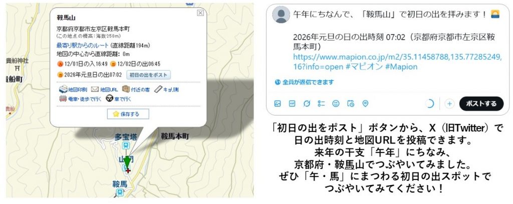TOPPANグループの株式会社ONE COMPATH(ワン・コンパス)が運営する地図情報検索サービス「Mapion(マピオン)」(PC版)において、2026年元旦の日の出(初日の出)時刻を表示する機能を12月15日に追加しました。地図ページ上で気になる場所を右クリックすると、2026年元旦の日の出時刻を吹き出しで表示し、旅行や帰省など外出先の初日の出時刻の確認ができます。また、「初日の出をポスト」ボタンを押すと、日の出時刻と地図ページURLとともにX(旧Twitter)に投稿することもできます。来年の干支「午年」にちなみ、「馬」がつくスポットで初日の出をむかえ、つぶやいてみてはどうでしょうか?なお、本機能は年末年始(2025年12月15日~2026年1月15日まで)限定の機能です。