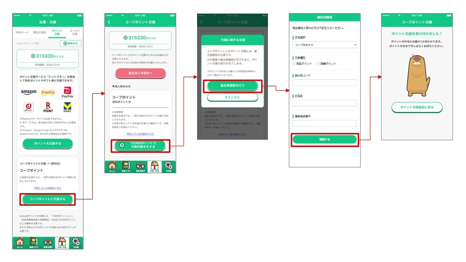 「aruku&ポイント」は、aruku&のアプリ画面上から直接「コープポイント」へ申請ができ、指定した生協の「コープポイント」へ交換することが可能です。aruku&内で貯めた72,000ポイントがコープポイント300ポイント (およそ300円相当分)として交換できます。コープポイントには、店舗で利用できる「店舗ポイント」と、宅配サービスで利用できる「宅配ポイント」があり、生協によって交換できるポイント種別が異なります。