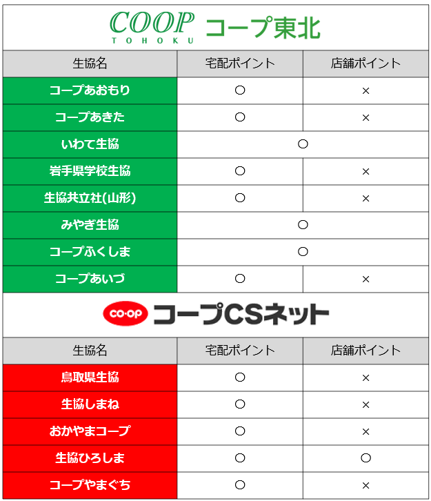 全国の生協のうち、ポイント交換に対応している生協と交換できるポイント種別は以下の通りです。