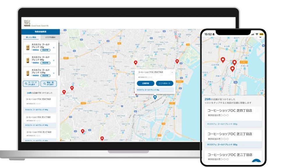 そこで、24時間365日いつでも最寄りの取扱い店舗を検索できるシステムの必要性を感じ、お客様の利便性向上と対応業務の効率化を実現するため、Mapion Biz「買えるお店マップ」の導入に至りました。これにより、ネスレ日本の商品を取り扱う全国の店舗情報や商品情報を、お客様が手軽に検索できるようになりました。