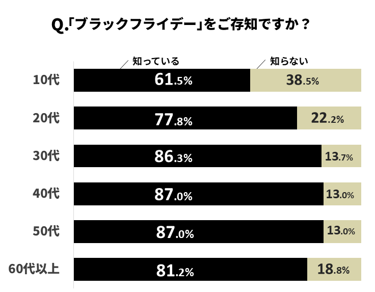 年代別に見ても、20代以上ではおよそ8割の人が認知しており、特に40代、50代では87.0%、60代以上でも81.2%と高い認知度を示しています。11月の買い物セールとして定着してきていることがわかります。