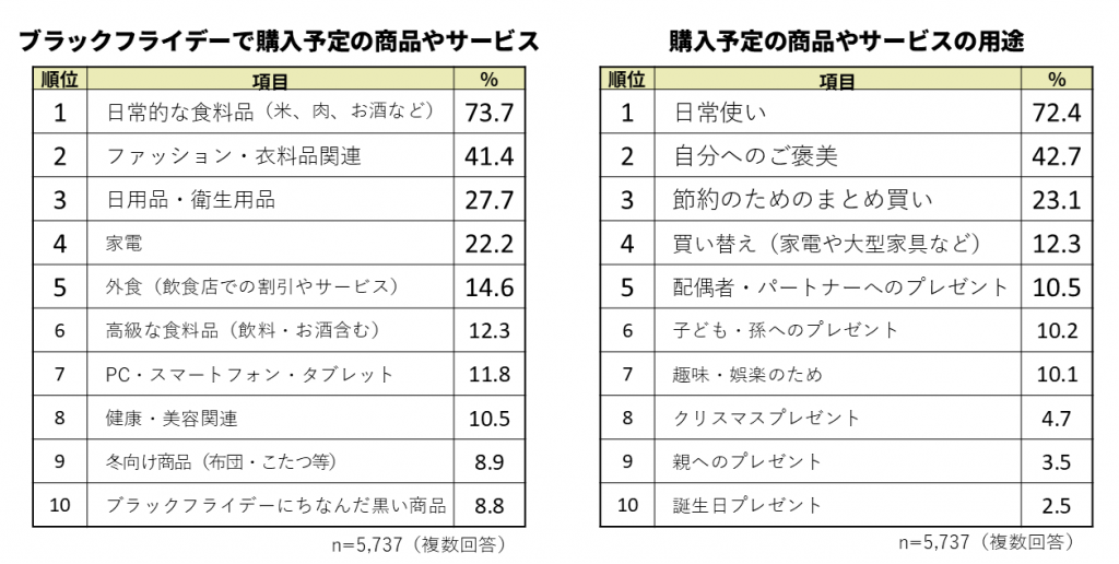 用途の2位には「自分へのご褒美」としてブラックフライデーを利用する消費者が4割以上(42.7%)いました。「靴やスポーツウェアを購入予定」(50代男性)、「冬服は高いのでずっと買いたくて高くて手が出なかった欲しいものが安く手に入るかもしれない」(30代女性)など特に、「ファッション・衣料品関連」(41.4%)や「健康・美容関連」(10.5%)の商品が人気です。