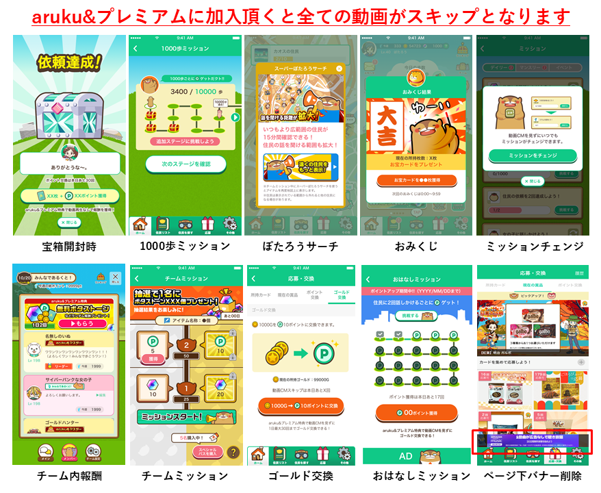 「aruku&プレミアム」は、ポイントが貯まる1,000歩ごとのミッション上限増加やすべてのアプリ内動画のスキップ機能、ログインするだけで毎日ポタストーンが付与されるほか、「aruku&プレミアム」限定の称号付与など、歩行を楽しむ機能が向上しました。