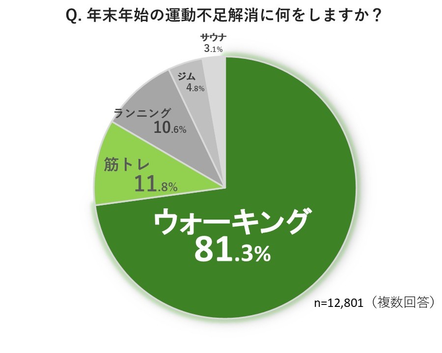 「年末年始の運動不足解消に何をしますか?」と聞いたところ、81.3%が「ウォーキング」と回答し、「ランニング」や「筋トレ」の回答数をはるかに上回る結果となりました。