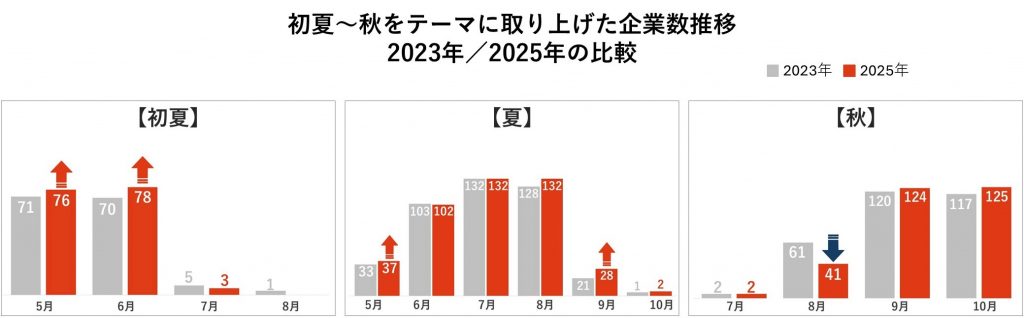 また、この夏の長さは「秋」の販促テーマにも影響していることが読み取れます。2025年9月に過去最多の全国250地点以上で猛暑日を記録したことから、2023年は8月時点で「秋」を取り上げる企業数が61社だったのに対し、2025年には41社に減少しました。