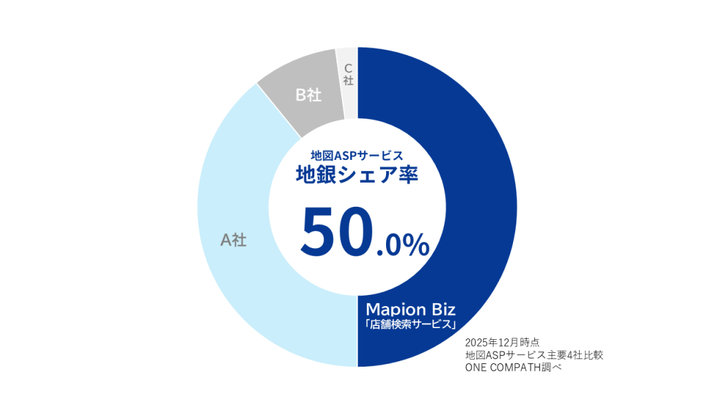 TOPPANグループの株式会社ONE COMPATH(ワン・コンパス 本社:東京都港区、代表取締役社長CEO:早川 礼)が運営する法人向けの地図ソリューション「Mapion Biz(マピオン ビズ)」は、2025年12月に行った独自調査によると、地図ASPサービスを導入する地方銀行の中で、企業のサイトで店舗を検索できる「店舗検索サービス」のシェア率が50.0%となりました。近年では、各金融機関のニーズに応じた多様なカスタマイズが評価され、地方銀行を中心に導入・リニューアルが相次いでいます。