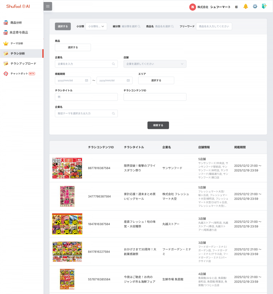 チラシ分析の新機能です。任意のテーマやキーワードを入力することで、該当するチラシ画像を一覧表示し、これまで市場でどのような訴求が行われてきたのかを視覚的に把握することができます。