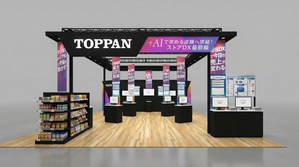 TOPPANブース(東5ホール、小間番号RT5502)では、「情報基盤ソリューション」「集客ソリューション」「店頭ソリューション」「バックヤードソリューション」の4つのカテゴリで、流通・小売業向けの販促活動や業務効率化を幅広く支援するTOPPANグループの各種ソリューションを紹介します。また、売り場を模したデモンストレーション形式の体験型展示も行い、AIやDXソリューションを活用した最新の店舗DXの取り組みを提案します。