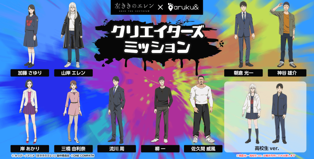 ウォーキングアプリ「aruku&」は、TVアニメ「左ききのエレン」とのコラボキャンペーンを開催します。待望のアニメ化が実現した本作品から、朝倉光一、山岸エレン、加藤さゆりなどの人気キャラクター10体と、物語の舞台となる神奈川県・横浜エリア限定の「朝倉光一 高校生ver.」を合わせて合計11体がaruku&のまちに登場します。