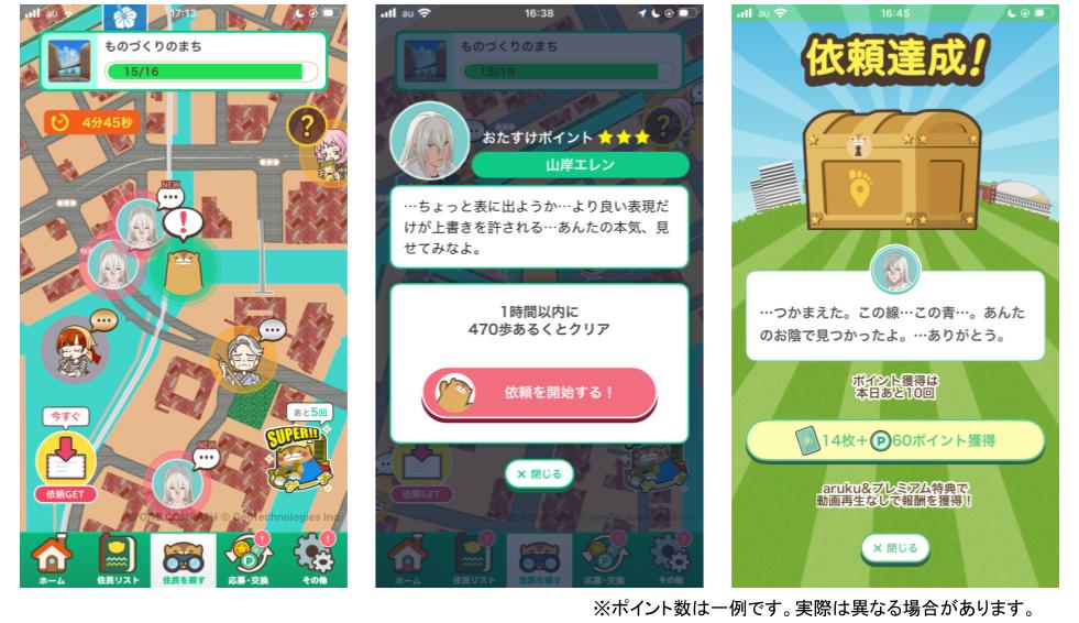 2016年11月より、株式会社ONE COMPATH(当時、株式会社マピオン)が運営している、「歩くことが楽しくなる」仕掛けが満載のウォーキングアプリです。アプリ内に登場する様々な住民キャラクターに話しかけると依頼が出され、クリアすると、地域名産品などが当たるプレゼントキャンペーンに応募できたり、現金や電子マネーに交換可能なポイントがもらえます。また、健康増進施策を進める自治体や企業、家族や友人同士などチームでの参加も可能です。
